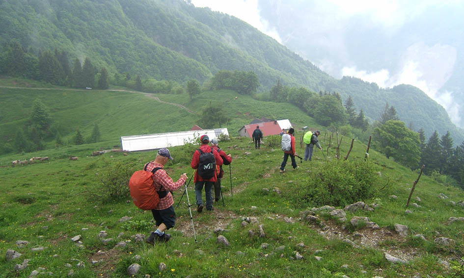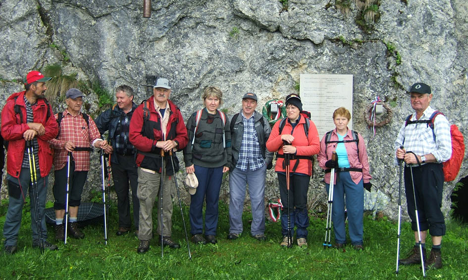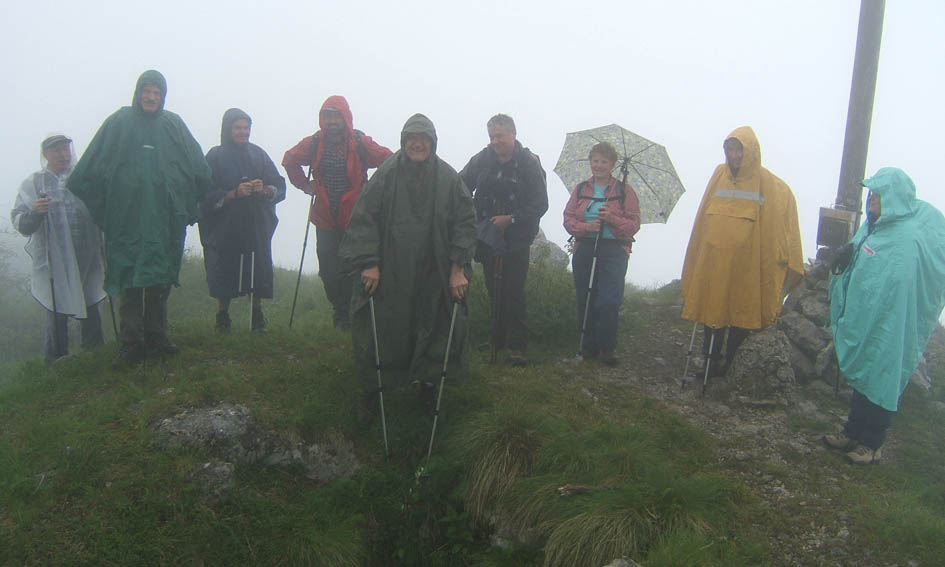 Čeprav vremenska napoved ni najboljša in nas je že na ogledni turi namočilo, se vseeno odpravimo. Iz Zatolmina krenemo po poti levo pod Vodel vrhom, mimo nekdanje domačije Podoreh. Vmes je bil odcep poti k Grofovi vodi, a smo jo tokrat izpustili. Hodimo mimo neštetih kavern in strelskih jarkov iz prve svetovne vojne. Pot se strmo dviga najprej skozi gozd, po približno dveh urah hoje dosežemo travnat greben med Mrzlim vrhom in Grmučem. Če se po vrhovih ne bi »obesila« megla, bi se nam ponudil lep razgled na vrhove onkraj Soče, tako pa smo lahko občudovali le dolino s prelepim modro-zelenim trakom Soče. Po zelo strmem pobočju se bližamo vrhu, ki pa ga že pred nami zagrne megla. Pa nič zato, začne se najlepši del vsake ture - malica, a kar naenkrat nekaj zašumi po grmovju in še preden se prav zavemo smo že mokri, še dobro, da imamo vsi zaščito pred dežjem. Hitro sestopimo na severno stran, po slabo označeni stezici do kaverne, v kateri so madžarski vojaki leta 1917 postavili oltar, tako, da je prostor služil tudi verskim obredom. Kapela je obnovljena in je bila ta dan tudi odprta. Nadaljujemo do planine Pretovč in po betonski cesti nazaj proti Zatolminu. Vmes smo bili deležni izdatne moče, kar pa nam ni pokvarilo razpoloženja.