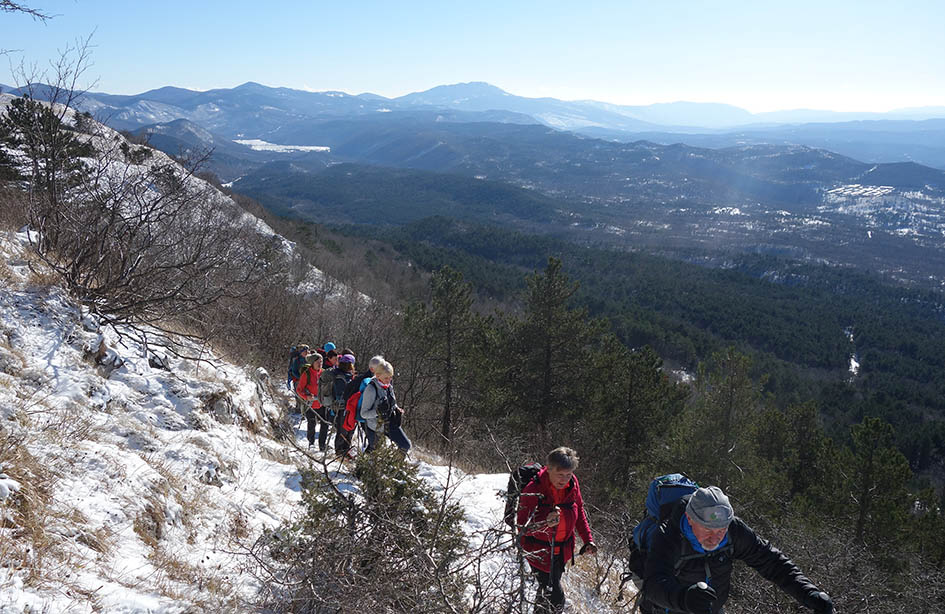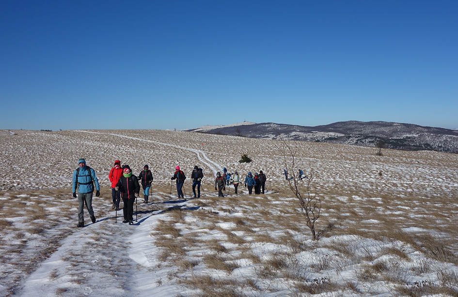 Ko stopimo na makadamsko pot se začne prava zimska pravljica, sneženi kristalčki vsenaokrog, pod nogami škriplje pomrznjen sneg. Po slabi uri prispemo v hrvaško vasico Brest, kjer naredimo krajši postanek. Pot se strmo vzpne, malo je treba tudi po vseh štirih. Hitro smo pri Planinski koči pod Žbevnico. Mimo starega vodovoda se vzpenjamo proti vrhu. Vse je mirno, sonce prijetno greje, ko pa stopimo na greben nas pozdravi burja.