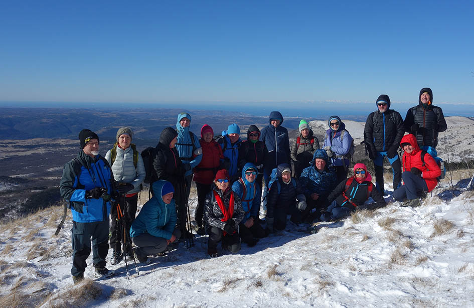 Na vrhu so prav prišla oblačila iz nahrbtnika. Razgledi od bolj oddaljenih Dolomitov, Julijcev, KSA, pa do bližnjih Slavnika, Učke, Snežnika in vse do morja so bili »šajba«. Po kratkem postanku v zavetrju vrha se odpravimo po širnih planjavah proti Špičastemu vrhu in naprej proti Lipniku. Vseskozi nas prestavlja še kar močna burja. V zatišju ob spominskem obeležju napravimo daljši postanek, potem pa skočimo še na vrh Lipnika »pokukat« v Trst.