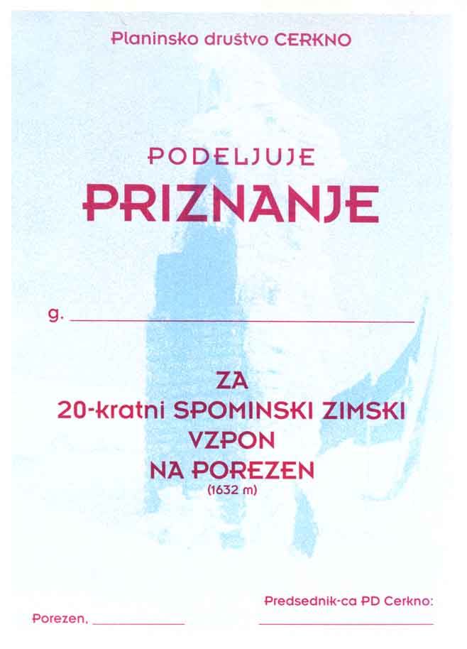 Priznanje za 20 zimski vzpon |